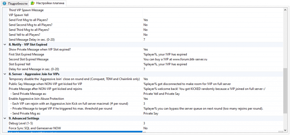 The following Plugin settings are important to provide multiple Gameservers with one global list of VIPs. The settings 'MySQL details', 'Gameserver Type', 'Server Group', 'Import NEW VIPs from Gameserver to SQL', 'Notify Vip Slot Expiered', 'EA GUID Tracking' and 'Aggressive Join Abuse Protection' have to be exactly equal on all Gameservers. In addition, the setting 'Import NEW VIPs from Gameserver to SQL' must be set to 'no (remove)'. In this way the Plugin and the VIP Sync works perfect.